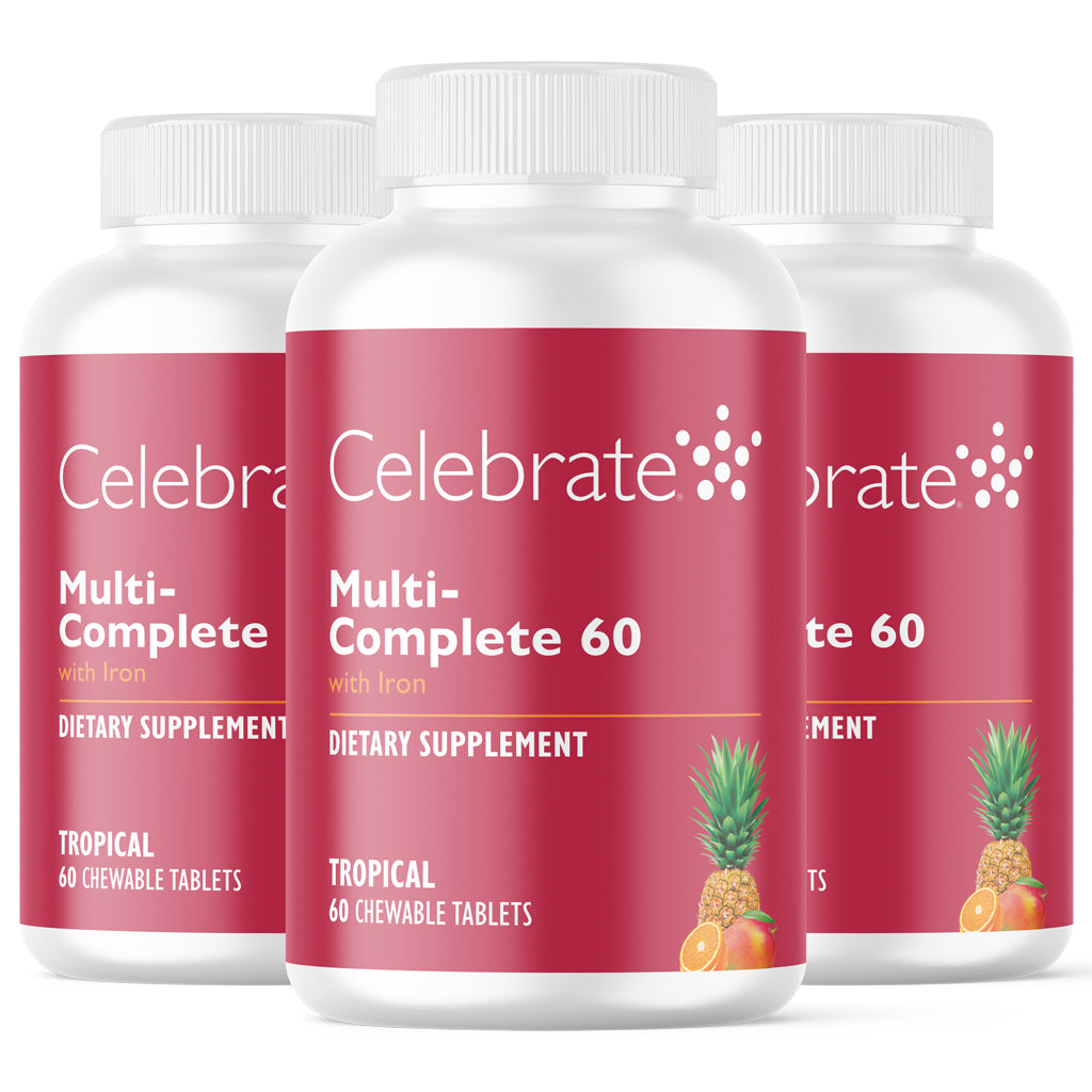 Celebrate Multi-Complete 60 contient toutes les vitamines et minéraux dans une option de dose fractionnée à deux par jour, les patients doivent simplement ajouter du calcium. Ce multivitamine a la teneur en fer la plus élevée de tous les multivitamines bariatriques sur le marché, ce qui le rend parfait pour le patient qui a subi une procédure d'anastomose unique et qui nécessite plus de fer. Ce multivitamine bariatrique répond aux normes de l'ASMBS pour les multivitamines et le fer après la chirurgie bariatrique et inclut également un niveau plus élevé de vitamine B-12 (1000 mcg). Cette formule intégrée offre une biodisponibilité maximale car nous avons soigneusement sélectionné chaque forme de vitamine et de minéral pour améliorer l'interaction et l'absorption. MC-60 est disponible en A mâcher (saveur Tropical) ou en un Gélule.
